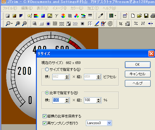 12-周りの黒い部分を、運転台の背景色で塗りつぶします。(今回は茶)その後、Jtrimでイメージ→リサイズと進み、画像のように二つともチェックが入っていることを確認し、縮小します。 13-完成!